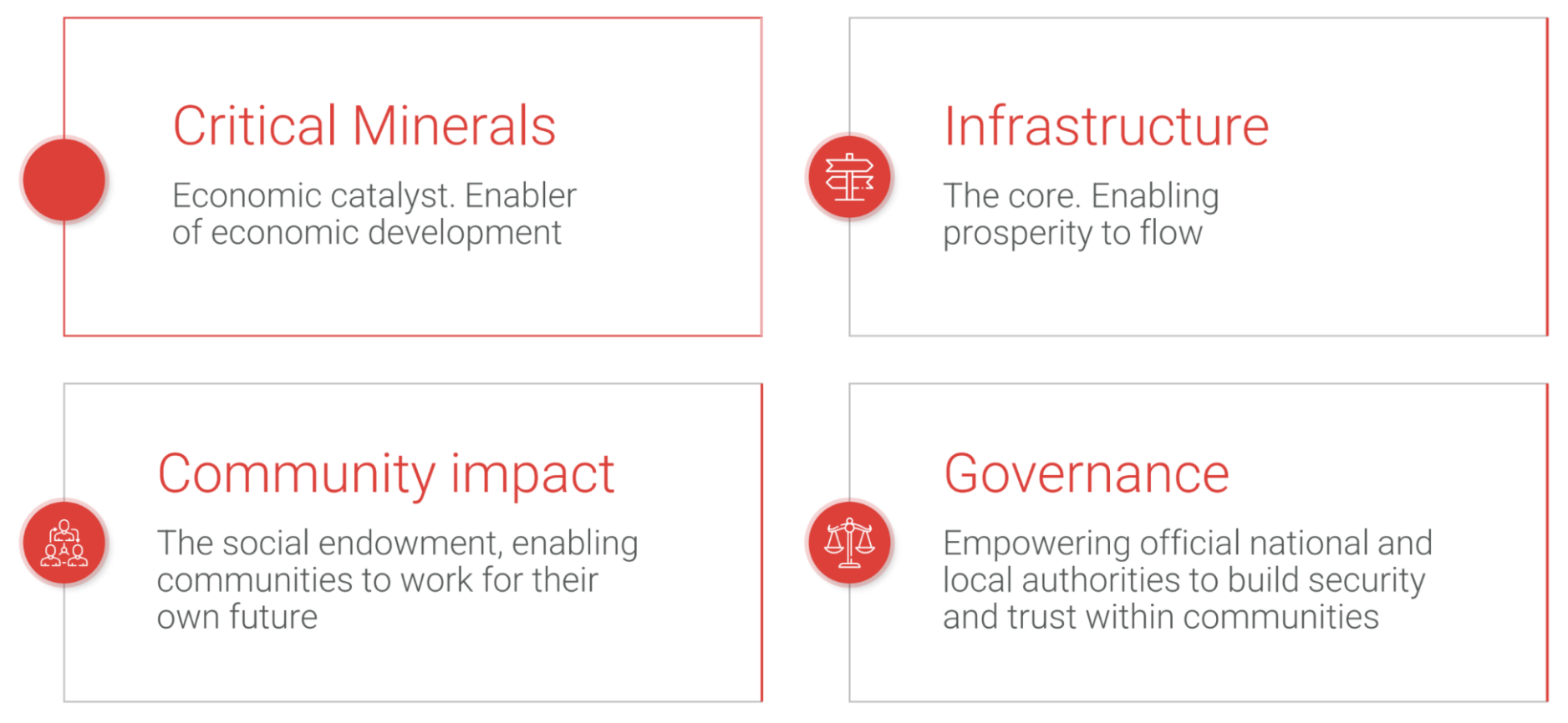 Our ambition for making our investments sustainable is reflected in a holistic approach that links critical minerals, infrastructure, community impact and governance approaches.